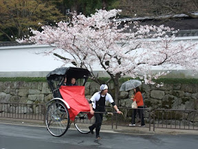 四条通還沒走到底就會見到紅色建築,那就是八坂神社了。也就是每年七月舉辦祇園祭的地方。不過賞櫻是要到裡頭的「圓山公園」。當天下著細雨,我們還是要去看看。雖然細雨的京都很有風情,但是不能在櫻花樹下野餐也是很可惜。因為當天攤販都擺好了,可惜天空不作美。櫻花樹下只見到野餐墊,樹下穿梭的是朵朵的雨傘。